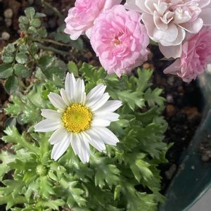 春の陽気に誘われて?かたい蕾だったノースポールの花が開いた🎉 ミニバラの鉢に 零れ種🌱⋆。の❁⃘*.゚ 4️⃣2月13日 の様子…ミニバラ色が違うわw冴えてる(૭ ᐕ)૭