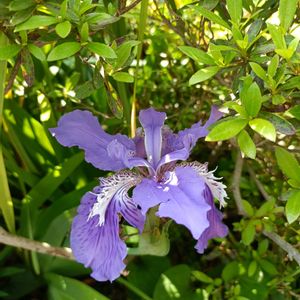 ★イチハツ(一初、一八)★ アヤメ科の多年草 花期:5月 帰化植物。高さ30-50cmの花茎が立ち、分枝して2-3の花をつける。花は径10cmほど、藤紫色、外花被片は倒卵形で先が丸く、内花被片は小型でともに平開。外花被片に濃紫色の斑点が散らばり、基部から中央にかけ白色のトサカ状の突起がある。 ※アヤメの類で一番先に咲くので、「一初(イチハツ)」の名がある。 植栽のツツジの足下に、ひっそり咲いてました🤗 2025.GW 七生丘陵📱