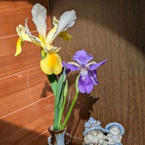 💜💛今朝の玄関💛💜 花友さんからいただいた アイリス💛とイチハツ💜 朝陽に輝いて✨✨✨ 元気をもらってラジオ体操しました🙆
