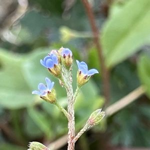 キュウリグサ ムラサキ科 日本全土の道端や庭などに多い 直径2㍉の淡青紫色の花を咲かす 花期は3〜5月だが珊瑚樹の下に咲いてました 本日雨上がりなので1.5㍉もないでしょう 中心部の副花冠は黄色(ミズタビラコの中心は白い)