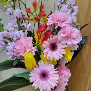近くの保育園で、卒園式に飾られたフラワーアレンジメントです🩷 ②グロリオサは、最近見かけなくなりました🌸