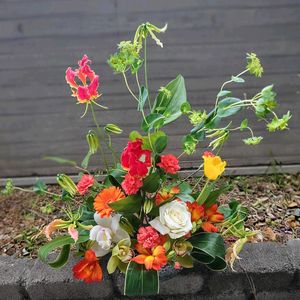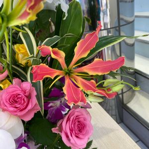 グロリオーサのフラワーアレンジメント 燃える炎のようなグロリオーサは 大好きなお花🏵️ 今年も球根を植えて自分でも育てます。 六甲山が見えるお教室で レッスンを受けてきました🩷 アルストロメリア,カーネーション, シンビジウム,バラ,チューリップ, ブプレリウム,ドラセナ