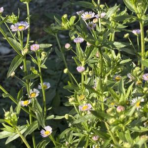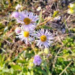 道端にヒメジョオン💠 団地辺りでも見かけるけど、もっと貧弱です ここではしっかり太い茎が盛大に枝分かれして、それぞれの枝にたくさんの花を咲かせています💠💠💠 寒い時期のヒメジョオンは花びらが薄紫のものがよく見られます かつてはハルジオンと間違えたりしました