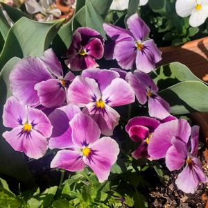最近開いたビオラさんたち ↖️ビビ アプリコットアンティークの3代目 2シーズン前に咲いた中でも、アプリコット色ではなく、黄色だった株(2021/2/24投稿)のお孫さん より濃く鮮やかな色になりました ↗️ふじいろももか 今年買ったタネで、発芽率も生長スピードも心配だった品種 やっと咲いてくれました✨ ↙️タイガーアイの2代目 親の面影は薄いですね ↘️こぼれ種 実はもっと早くに開いていたはずの株があったのですが、コガネムシの幼虫にやられてダメになってしまい…😭 📷️11/28, 30