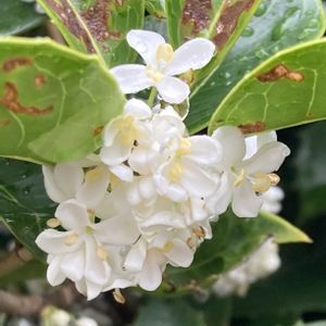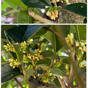 銀木犀 銀木犀の木に 白と黄色の花が咲いた チラホラと黄色が見える 隣り合って並ぶ金木犀と銀木犀 40センチくらいしか離れていないのだけれど 調べると稀に こういったことがあるそうで 香りは銀木犀 ⭐️金銀 縁起がいいぞ🌟 植えて15年 2メートル程度の高さになるように毎年バッサリ🪚切ってる