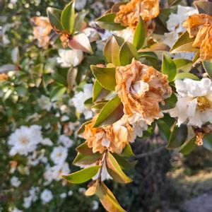 🩷🤍サザンカ 一本の木からピンクと白のお花 初めて見ました😳 ①②紅白サザンカ ③駅前の白八重サザンカ ④⑤香るギンモクセイ
