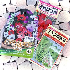 サラダ用春菊と赤丸はつか ちょい足し野菜になるかしら🤗 (『みどりのまとめ』作ってみよーかな💓) 花壇用にアネモネと もう植えちゃったけど水色クロッカスの球根も🩵 あいあいパークからお迎えしました🙌