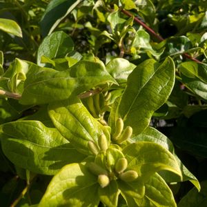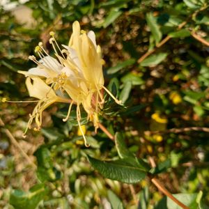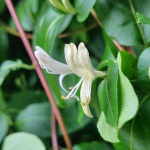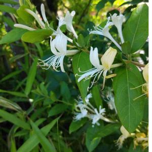 『愛の絆』『献身的な愛』『友愛』。「愛の絆」は、他の木につるを巻きつけて離れない性質に由来するといわれています。「献身的な愛」は、薬草として利用されてきたことにちなむといわれています。初夏に甘い香りの花を咲かせ、寒い冬にも緑の葉っぱを茂らせていることから、庭木として古くから親しまれている植物です。