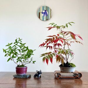ハゼ(右、樹高30cm)の紅葉とスイカズラです。スイカズラはもう少し寒くならないと色付かないみたいです。 The autumn leaves of a Japanese wax tree (right, 30cm tall) and honeysuckle. It seems the honeysuckle won't turn color until it gets a little colder. 🍁