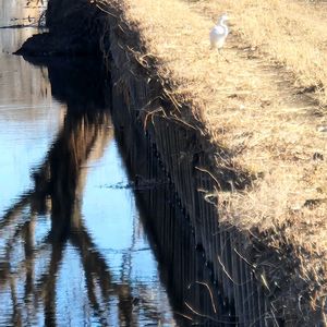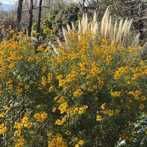 水生植物公園水の森にて 外の庭園を歩いていたら 枯れ木枯れ草の中に黄色い花が… レモンマリーゴールドでした💛 葉にレモンの香りがするキク科の多年草 近くにはパンパスグラスもありました🌾
