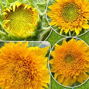 ひまわり🌻 ドワーフ サンゴールド✨ 左上から時計回りに変化します 最後は左下のフサフサの姿になります🌻 今朝は長雨に打たれたのでションボリしています⤵️ 今日もお元気で🤗 良い一日となりますように🌸 🏷月曜日にビタミンカラー ドワーフとは 人間より背丈の低い伝説上の種族を意味します この子はミニひまわりです🌻