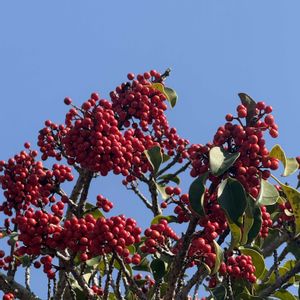 大雪の日の病院で⛄️❄️ この真っ赤で密集している実は 何でしょうか😳⁉️ クロガネモチ、サンザシ、イイギリ 一本の木に違ったなり方をしている不思議な実🍒 2/8から降り積もった雪のため、車は諦めて電車で辿り着いた病院🏥 ウソのように晴れ渡った空に向かって赤い実を付けた木が3本🌿 やはりクロガネモチでした🙋♀️ すずはなさん、ありがとうございます🥰 2026.02.09 撮影