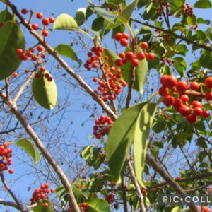 晩秋を彩る植物たち イチョウ、クロガネモチ、クサギ ⬅️イチョウ (小室山) お日様を浴びて金色に輝いてます🌼 裸子植物で落葉高木 街路樹や公園樹として植えられている。イチョウ科、イチョウ属 ⬆️クロガネモチ (佛現寺) 真っ赤な実だけど名前に黒が付くのね❤️ モチノキの仲間で若い枝や葉柄が黒ずんでいることからこの名前。 モチノキ科、モチノキ属 常緑中高木、中国名は鐡冬青 ⬇️クサギ (ダム湖) 赤い萼の中にある青紫色の丸い実が特徴的🤗 直径9mmくらいで光沢あり まるでお正月につく羽根つきの羽根のよう🎍 また、岐阜県の手作り人形の"サルボボ"にも似てるかな❣️ 葉に独特の臭いがあることからこの名がついています。 シソ科、クサギ属の落葉低木