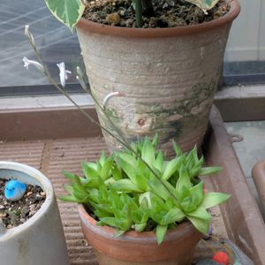 おはようございます😊 ①多肉の花が咲きました。 ②今年も見事なクレマチス八重咲き。 ③もう 紫陽花の蕾!早いな😧 ④羽衣ジャスミン咲き始めました。 ⑤ここの主役は スーパーのネギの挿し木?です😅