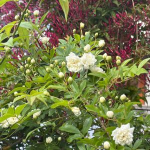 ①白モッコウバラが咲いてきました、奥の羽衣ジャスミンもたくさん赤い蕾がついています。 ②クレマチス ベルオブウォーキング咲き始めと開花で、表情が変わってしました。 ③フランネルフラワー、増えてはいないけど、枯れずに玄関で迎えてくれています。 ④ライムグリーン葉のコデマリも咲いてきました。 どんなアレンジに使おうかなー? ⑤オダマキが今年はたくさん咲いてくれています。