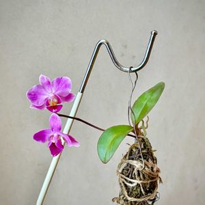 胡蝶蘭 ミニかミディか分からなくなりました。😅 高芽が出たので取って水苔で巻いて吊るしました。🌱 着生ランなのでどうにでも楽しめますね。🥰 滅多に出ないが栄養過多か、株が弱ったりするとかで高芽が出るとか。 (検索🔍)