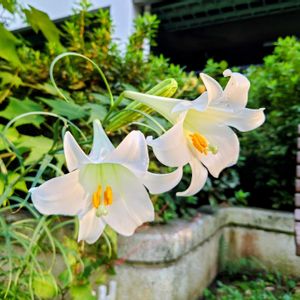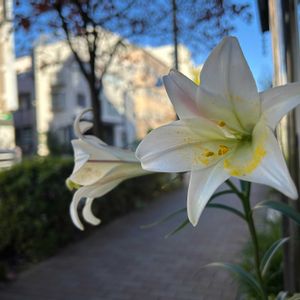 寒くないですか❓ 夏にたくさん咲いていたテッポウユリのいくつかが蕾を付けた。そして数日前の暖かい日に一斉に開花💧 陽射しの強い日はいいけれど、日が翳ると寒そうで気の毒になる🥲