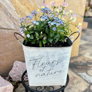 先日届いたPWの花苗を寄せ植えにして、玄関前に飾ってみました ミオソティス・ミオマルクとネメシア・アロマンス・ハニーピーチ