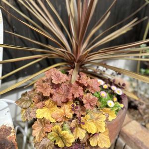 ①コルジリネの大きい寄せ植え😊 ②ヒューケラドルチェのバタークリームがとても大きくなり新しい葉がたくさん出てきました😆 ③少し彩りが欲しかったのでデイジーを隙間に入れてみました🥰