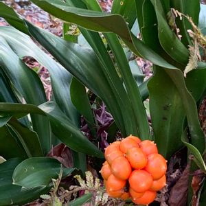 濃い緑の葉と朱色の実のコントラストが美しい "オモト(万年青)" 中国から日本の暖かい山地に自生するスズラン亜科の常緑多年草 観葉植物として鉢植えで栽培される古典園芸植物の一つです。 古くは徳川家康が江戸城へ入る時、家臣が献上したとされています。 その後、大名や旗本、更には一般庶民にも広がり、一部は利殖の対象となり、天保の改革の際の規制の対象となったほどでした。 古典園芸植物の一つ、今でもたくさんの愛好家がいます。 キジカクシ科(クサスギカズラ科) スズラン亜科、オモト属 Wikipedia 参照