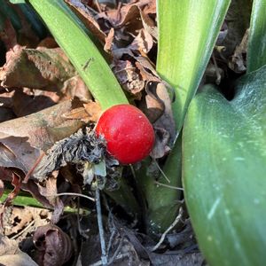 オモトがモリモリでなんとかしなきゃなぁ〜🤔と周りをめくってみると👀 なんと、なんと赤い実⁉️だろうか… 初めての出来事で😱 今朝は驚きました‼️ これからどうすれば良いのだろうか…😰