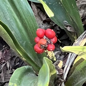 おはようございます✨ 1️⃣↙️2️⃣神社にてクリーム色の部分の多いオモト(万年青)に出会えました 宝船という品種に似ています 万年青の品種は現在で1,000種類を超えるとされており、原種は以下7種類からと言われています。 ・縞獅子・大黒殿・端泉・秋津島 ・外輪山・聖光都の図・千代田の松 いずれも和名なのは、万年青の原産が日本であることから。江戸時代の1590年頃、江戸城に徳川家康が入城の際に、徳川家の栄誉を願い常に葉を付ける万年青を献上したというエピソードもあります。コピペ 3️⃣4️⃣5️⃣は自宅庭にありますが赤い実はこれだけです