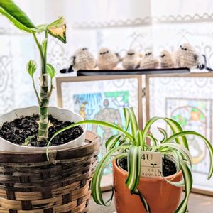 ⭐️⭐️⭐️三ツ星品質モニター⭐️⭐️⭐️ 「オリヅルラン ボニー」& 「デヘンバキア クールビューティー」 ①先日📪️のシマエナガ お顔を修整して6羽家族になりました🍡🍡 と一緒に記念撮影😁 ②オリヅルランは葉先が少〜し傷んでいますが、大きな変化はありません😅 ③デヘンバキアは不在中の低温🥶で瀕死状態でしたが、復活の萌しが🌱 頑張れ〜💪 ④昨年モニターした「プリムラ ポップル」 零度前後の風除室でも元気に咲いています✨️💛✨️ 先日、『三ツ星品質』として紹介されていましたね👍