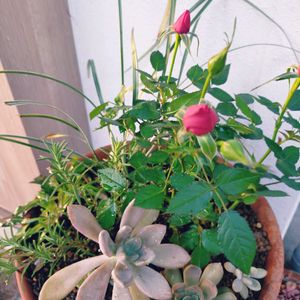 こどもが卒業式でもらったミニバラを入れて寄植えにしてみました🌹 咲いてくれるといいなぁ。