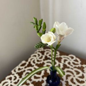 フリージア1本 香り高く 大きな存在感 1番好きな花 今日はお雛様を片付けました。 1、気分を変えるちょい生け 花器: コバルトブルーのビンテージガラス 花材: フリージア、オリヅルラン 2、横から見たところ 3、マイナス20度の極寒の冬を乗り越えたクリスマスローズにたくさんの蕾がついていました😌🙏🌸