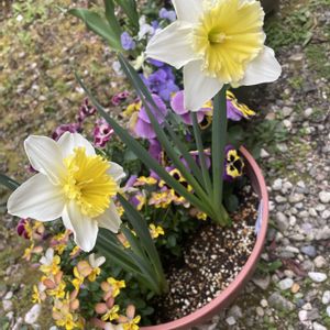 我が家の寄せ植え🌼 ①② 水仙 3/26 一つめの花が咲き、 今日 3/28 二つめも開花しました😆 ③ プリムラジュリアン🌸 毎日 良く花が咲いてます🌸 チューリップ🌷 蕾 少しずつ膨らんできてます٩( ᐛ )و ④⑤ 久しぶりに オリヅルラン 伸びたランナーの先に 花🤍🤍🌿が 今日 開花しました🤗 白い花が綺麗です✨