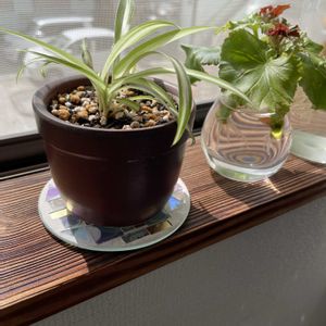 このキラキラのコースター、一目惚れして買いました👀✨ 少しアクセントになります🤏🏻 最初はマリモの下に敷こうかと考えていましたが、思いの外キラキラが見えなくなったのでオリヅルランに🧐 日差しが当たるとより綺麗です👏🏻 オリヅルランの隣は、冬越しして剪定したベゴニアの水挿しです🚿 発根成功しました✨ 赤い葉は新芽です🌱 しばらくこのままにしておこうと思っています🌿