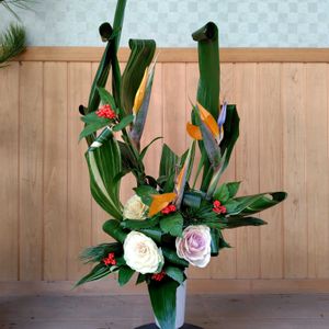 散策路、本日の締めくくりは花束・寄せ植えです。新春らしい彩りにたくさん出合えた1日でした。