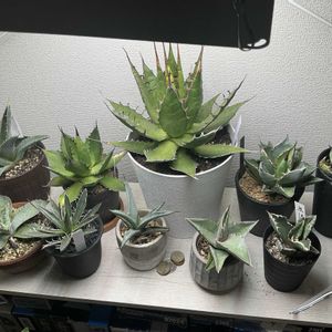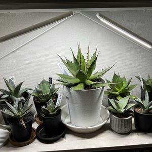 アガベsadさんです 元気そうです たぶん 子株なのか中株なのかもわからないので教えてほしいです 横の浪人とサイズが似てるので 一緒に育てていきたいです♪