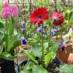 強い雨の一日になりそう..10:10〜20 鮮やかな軒下の花々 ❶ 真紅の宿根ガーベラ ガルビネア🆕 ❷ ハートカズラとチューリップ🌷 ❸ 一応上向き.. シクラメンアンジュ ❹❺ 未だ カット出来ず😅クリロ