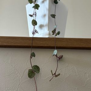 今晩は🌟 この子も冬でありながらちゃんと成長している証、つるが伸びました😊 いつもはつるを鉢の土の上にクルクルと𖦹巻いて置いてます。 その方が( ·∀·)良いとか!😄 ふちっこにミドリ🟢の子が共存しています。 あなたは誰? そのままにしておこっと😊 別名 ラブチェーン⛓️🥰 可愛い💕