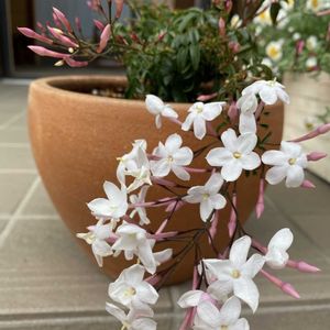 GS今日のお花 ♡ジャスミン♡ ①…ハゴロモジャスミンのハンギング お気に入りのpic☺️ ②…マダガスカルジャスミン 今年は葉っぱがなくなったまま… ✨😇になったのかも…😢 ③→⑤ バラ咲きジャスミンの色の変化 すべて過去picです
