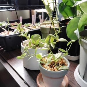 🌿カンガルーポケット🌿 初めて袋を見た時衝撃的でどうしても育ててみたくなり購入。 半年位経ったと思いますが常にちびっと咲いてます😅体力大丈夫なの?と、ちょっと心配🥲 先日鉢を覗いたら株元で腐りかけのような部分を発見! 引っこ抜きそのまま捨てようと思ったんですが、挿し木出来るんじゃ?と、手前の鉢はただ挿してるだけです。 駄目になったほうに鞘があったんですが諦めてカットして捨てました😭 袋も1つ寿命がきたようなので残り2個になりました。 手前の子、根付いたとして袋ってどうやって作るのかしら?袋無しのままなのかなぁ?