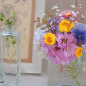 玄関に生花を🌿🌸 先日飾った切り花が萎れてきたけれど 風が強すぎて、買い物に行くのは億劫😅 庭に咲いてる花をカットして挿してみました 瓶の口が広くて上手く挿せないけれど 何か可愛いかも😊 ちぎれたペペロミアの水挿しから白い根が出てきました👍 種まきっ子からのお花を飾る日が楽しみᕷ⋆͛*͛