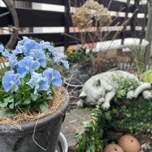 青いビオラ可愛い 花壇の縁のニャン 何時もここ可愛い♡ 🏷️ニャンニャン祭り参加です🐾