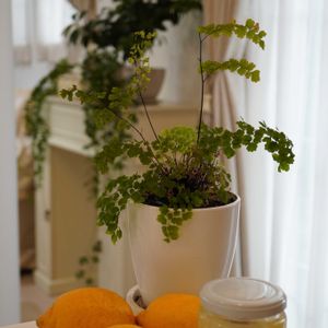 [今日のお花] 我が家のダイニングテーブルでほったらかしのアジアンタム🌿 with lemon🍋 夏は室内が涼しげになりますよ。 冬期は定期的に葉に霧吹きをかけてあげないとなあ、、