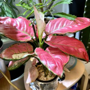 モーニングジャングル😊お気に入り😊アグラオネマオースピシャスレッド😊新芽は白でどんどんピンク🩷に変わっていきます😊かわいい🩷です〜😊寒さに弱いのでダイソーの保温バックを活用😊