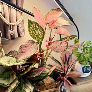 ピンク三姉妹♡ 新入りのカラテア・ニューメダリオン ただ立ち寄っただけのモール内の花屋さんで一目惚れして、一時は我慢したけど、やっぱり忘れられなくて後悔する気がしたから、結局連れて帰ってきちゃった 葉っぱのピンクとグリーンの混ざり合った色合いがかわいい! 直感って大事! アグラオネマ・ビューティー ストロマンテ・サンギネア・トリオスター おまけにスマートプランターivyのシンゴニウム・ホワイトバタフライ ライトはBrim FLORAを使っています