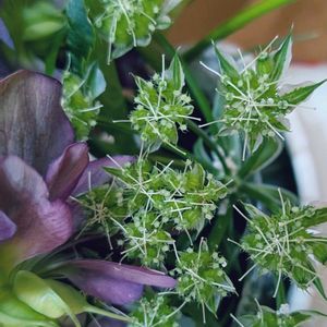 雨が降る前に、カットしていたクリスマスローズ。と、何の種になりかけか分かります? 『あら!?可愛い』と、一緒に生けちゃいました。 オルレアなんです、 雨で折れそうだったので、のっぽになった部分✂。 夜間、風も強くなりそうなので、念の為。