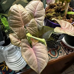 おはようございます。 シンゴニウム・ライム 室内に入ってアロイドみんな色が薄くなってるから特徴が消えてるんだけど葉っぱの中心の葉脈だけがピンクになる明るい緑の葉っぱが可愛い。ネオンみたいないかにもピンクな感じじゃないのが好みです