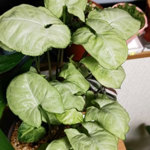 実はこのシンゴニウム、この大きさ(4号)で6、7年になります。 最初は百均。3、4年この大きさで止まってます。 多分、土が合ってないんですが(サボテンの土😅) 状態が万全でないので植え替えの機会を逃してます。 今年は植え替えてやろうと思ってます😊