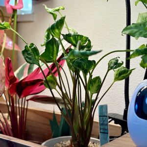 シンゴニウムネオンらしき植物が沢山あってその中の1つに珍しいのが。くるまった葉っぱの裏が緑と白、緑と赤とか斑が入ってる。しかもデコボコしてる!こんな種類ってある?