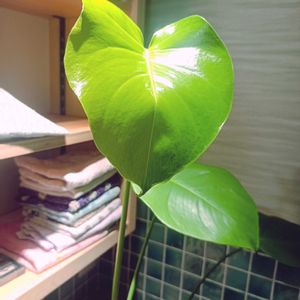 モンステラ 2026/4/4撮影 去年、ダイソーで330円で買ったモンさん。 先月ひと回り大きな鉢に植え替えたら、新芽が伸びてきて昨日開きました✨️ 開いたばかりの葉っぱは、表面がツヤツヤで、上からの光を反射してキレイです。
