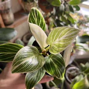 お迎え😊フィロデンドロンホセボーノ😊成長点が無くなった訳あり品ですが無事復活して欲しいです〜😊 【品種特徴】 ホセボーノ(ジョセボーノ)は、フィロデンドロンの中でも、特に美しい斑入り葉が魅力の品種です。 葉は大きく、鮮やかなグリーンの地色にクリーム色や白の散り斑が不規則に入ります。 この散り斑の入り方は一枚ごとに異なり、個体ごとに唯一無二の表情を見せてくれる点が人気の理由です。 葉の縁は丸みを帯びつつもギザギザとした切れ込みがあり、全体として柔らかさとワイルドさを併せ持っています。 ホセボーノの葉は、他のフィロデンドロンの多くと比べてやや薄く、繊細な質感です。 そのため乾燥に弱い傾向があり、葉が傷みやすいため、空気が乾燥しすぎないよう注意が必要です。 耐陰性が強く、室内の明るい日陰で育てやすいですが、あまり暗い場所に置くと徒長しやすく、葉柄が間延びするため、適度な間接光が必要です。 オシャレな演出にピッタリで、育てやすく、初心者の方にもオススメの品種です。 【フィロデンドロンについて】 フィロデンドロンは、世界の熱帯から亜熱帯におよそ650種もの植物を有する大型グループの観葉植物です。 つる性や直立性、葉の大きさ、模様など、品種によりさまざまです。 熱帯育ちのため、暑さに強く寒さに弱い、水をとても好むといった特徴を持ちます。
