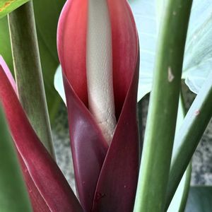 高層ビル街の花壇に赤い苞に包まれたセロームみたいなお花発見👀🫢‼️ フィロデンドロンというそうだけど、赤いのは初めて見た〜♥️♥️♥️