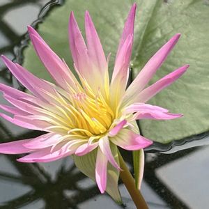 神代植物公園の熱帯スイレン 💖ダーシー・プレスネル💖No.62 💖花弁中央は黄色、花弁元は白で先に行くほどピンクが濃くなっていきます、細長い花弁が大きく開く独特の花姿をしている 🍃葉は緑色で薄く茶色の丸い模様が入り葉裏は薄い赤色です 💖水曜日のスイレン